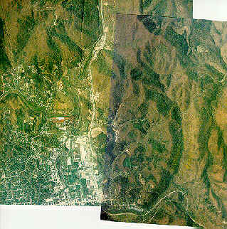 The following is from a pair of aerial photographs obtained from the Kentucky Geological Survey. The city is in the lower left, and the rim of the impact feature is visible in the right portion.